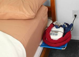 The Bedside CPAP Table is perfect for home and travel use. For those with small nightstands or no night stand the Bedside CPAP Table fits between the mattress and box springs and holds any CPAP machine and humidifier.