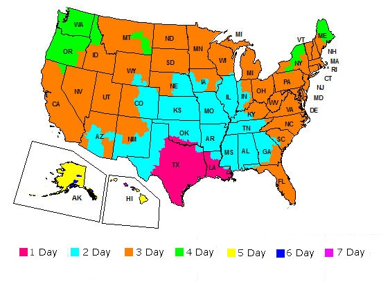 Sleep Restfully ships by either USPS or Federal Express depending on the value, weight, size and other considerations of your order. In most cases orders over $99.00 and every order requiring a signature will ship by Federal Express. The following map will provide an estimate of delivery time from our facility to your location when shipped by Federal Express.